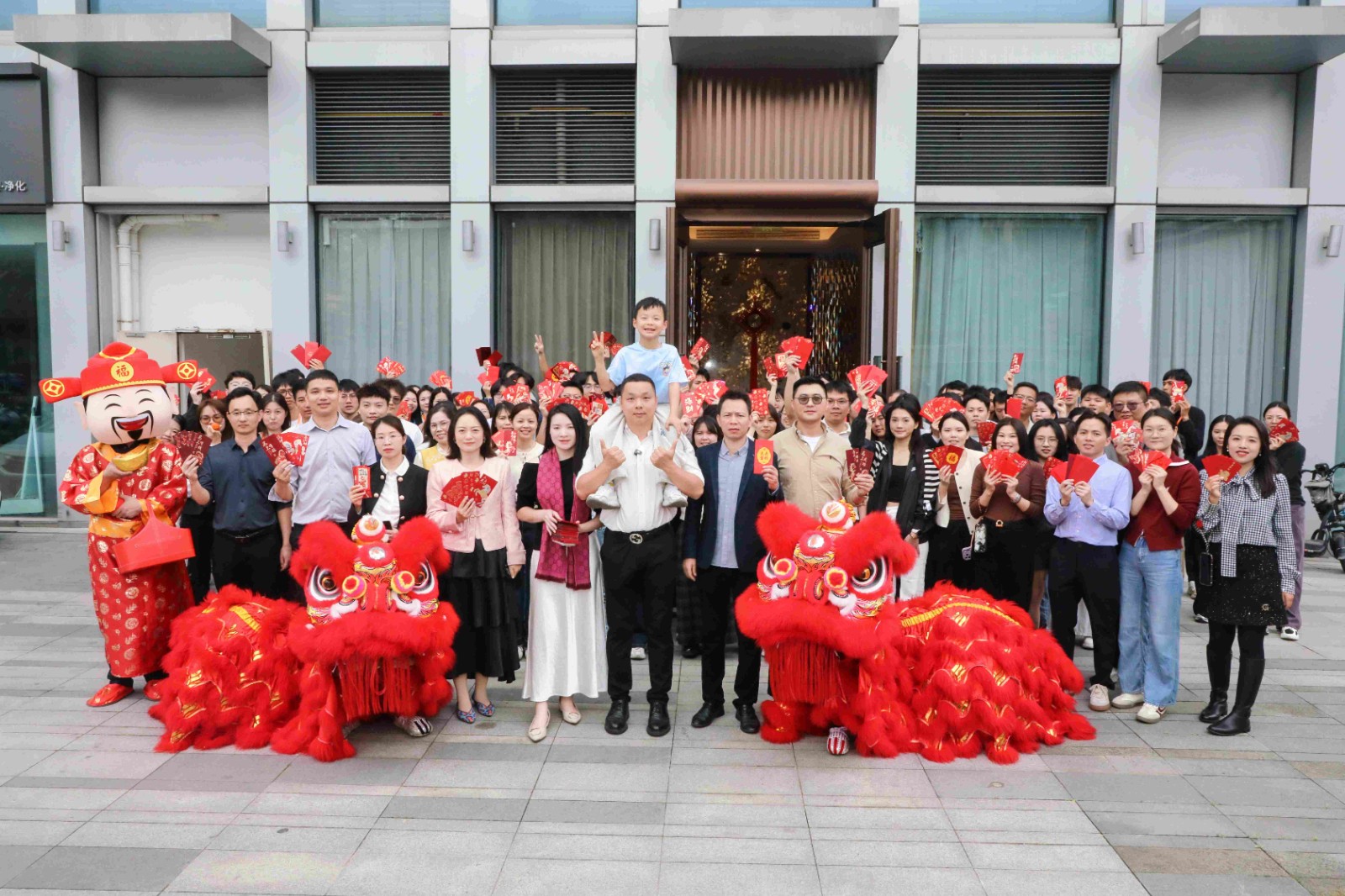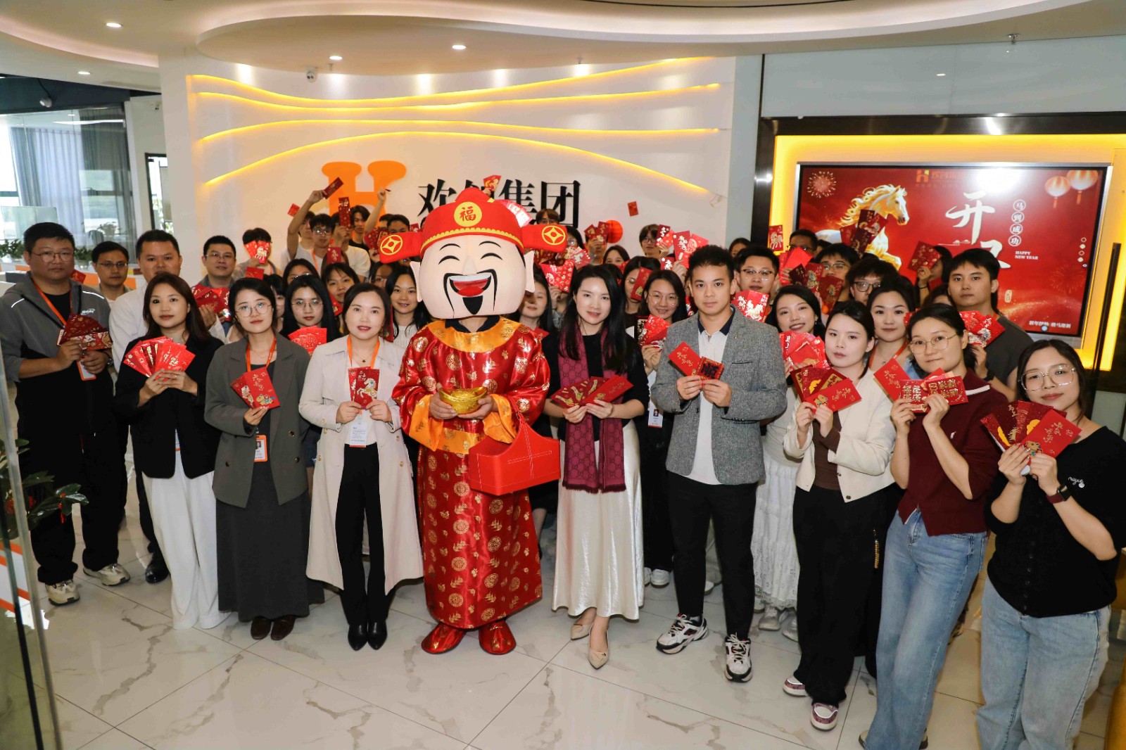 欢创集团董事长罗宁弟先生,党支部书记、总裁陈文舒女士,总裁郭志鹏先生携管理层,共同为员工派发寓意吉祥的开工利是。红包传递之间,笑语洋溢,祝福满场。